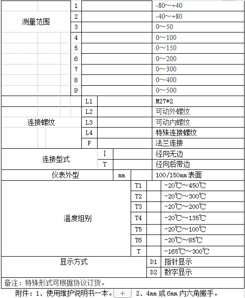 選型須知:請?zhí)峁┬吞?、表盤直徑、精度等級、安裝固定形式、測溫范圍、控頭長度或插入深度。