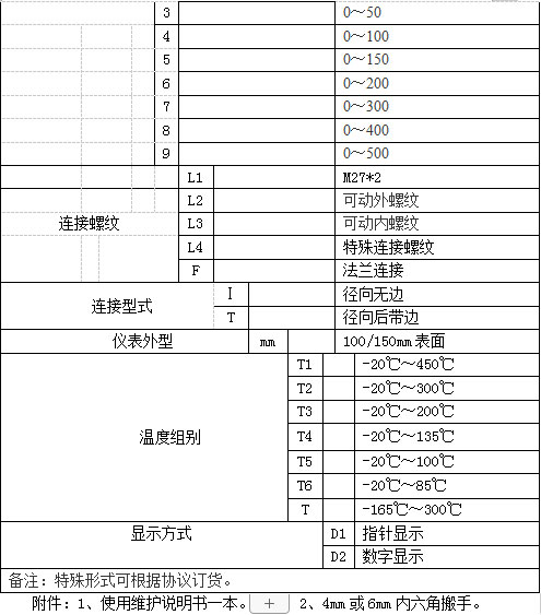 6.4選型須知:請(qǐng)?zhí)峁┬吞?hào)、表盤(pán)直徑、精度等級(jí)、安裝固定形式、測(cè)溫范圍、控頭長(zhǎng)度或插入深度。