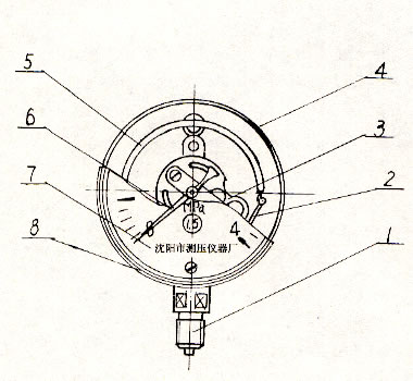 1.接頭 2.連桿 3.傳動(dòng)機(jī)構(gòu) 4.表殼 5.彈簧管 6.指針 7.度盤 8.罩圈